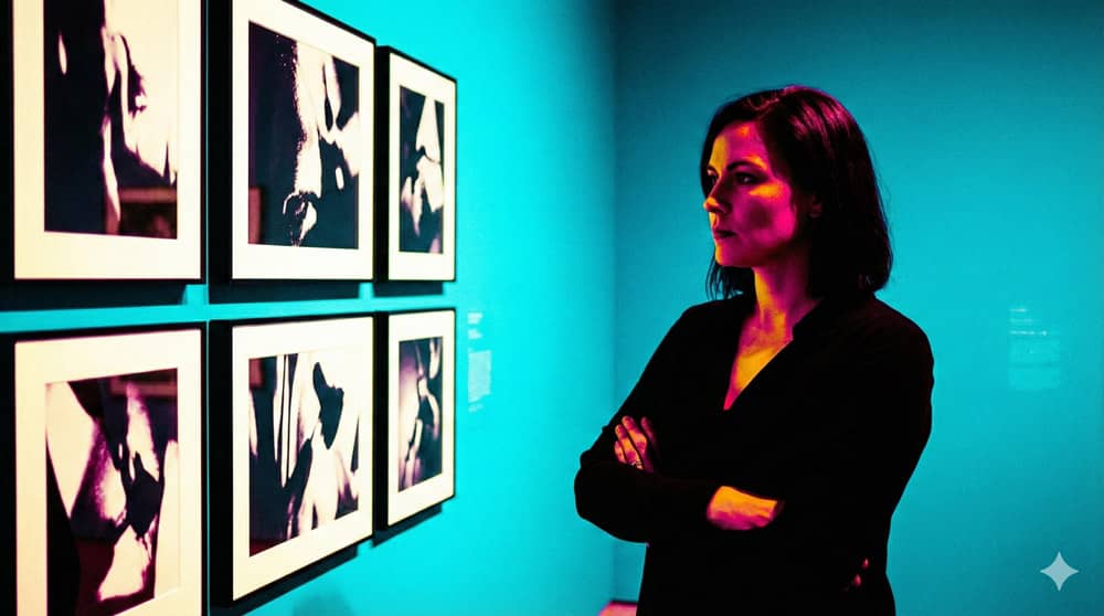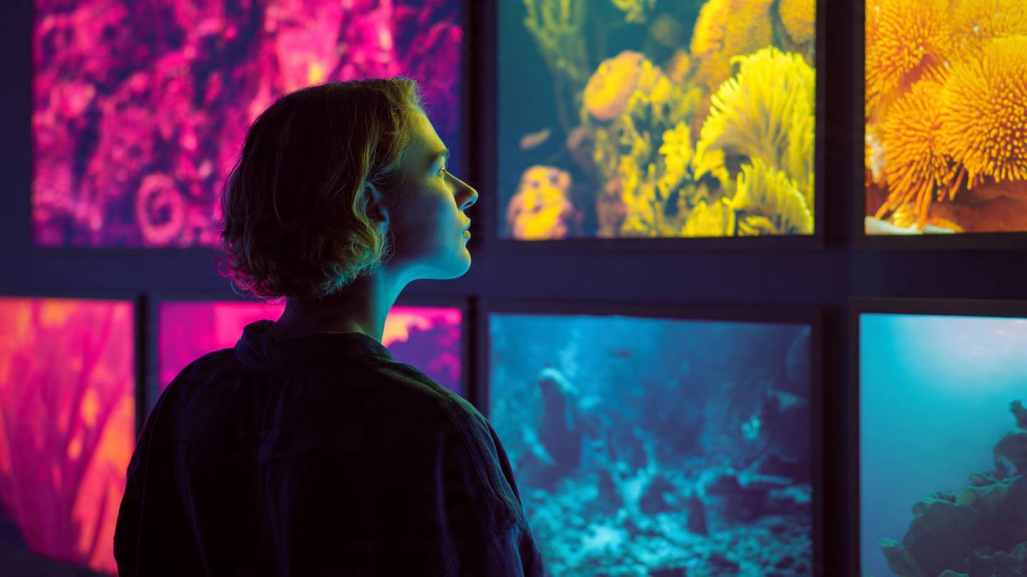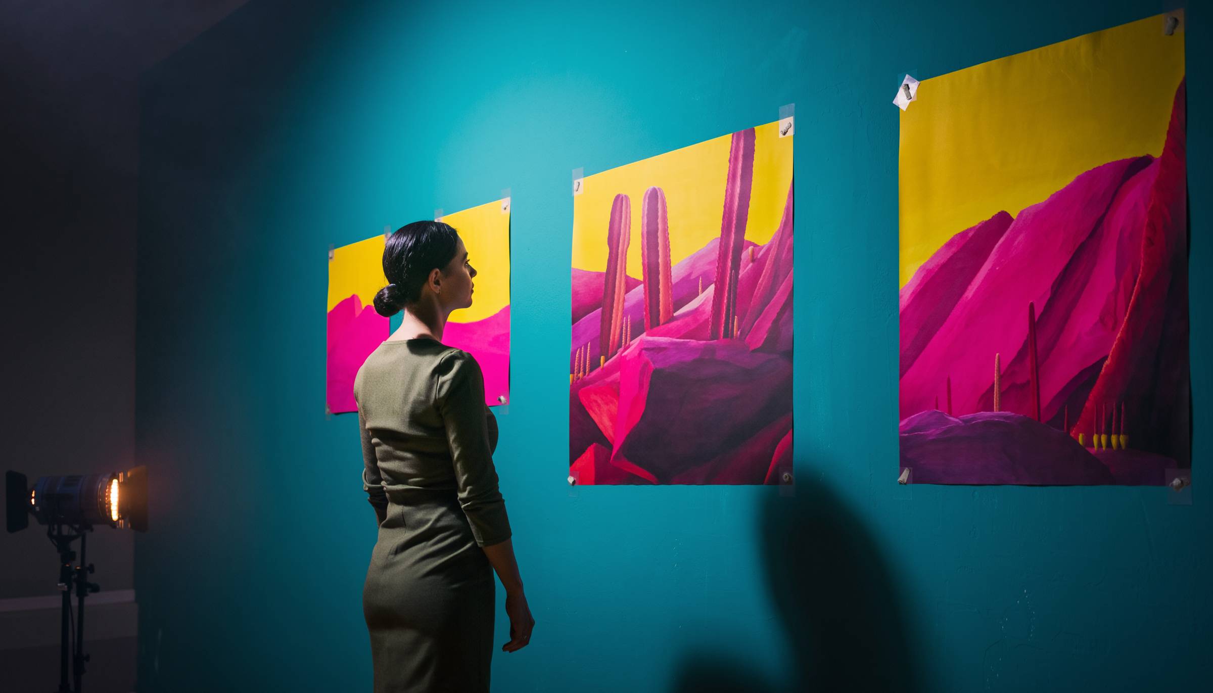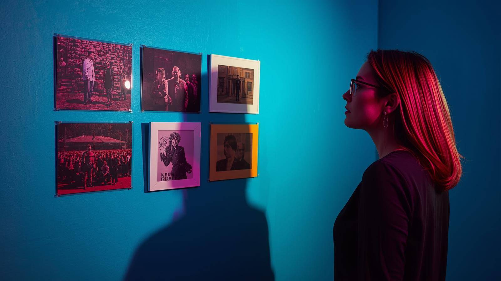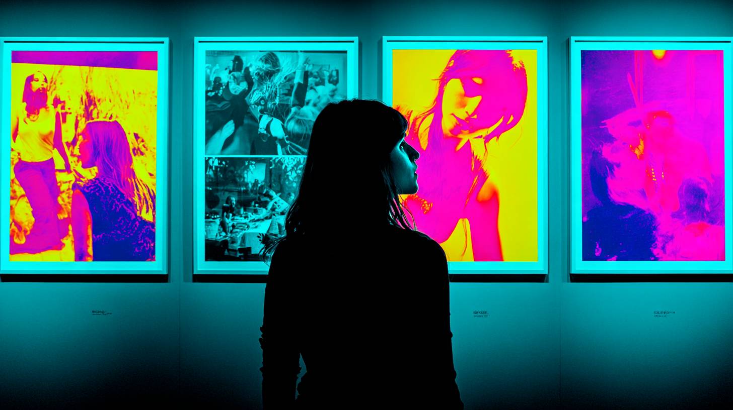 a photo of a woman is looking at an array of images on the wall. She's evaluating six different images. A vibrant, high-contrast photo. The lighting is dramatic, and exaggerated in magenta and yellow tones, set against a cyan background. There's a strong use of shadows and highlights to create depth. Use minimal background to keep focus on the figures and objects. --ar 16:9