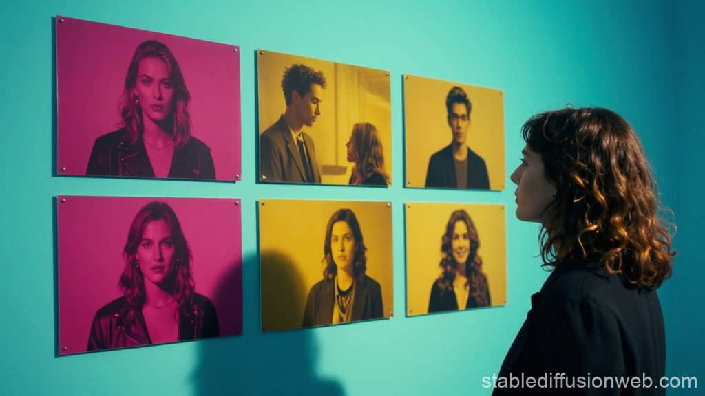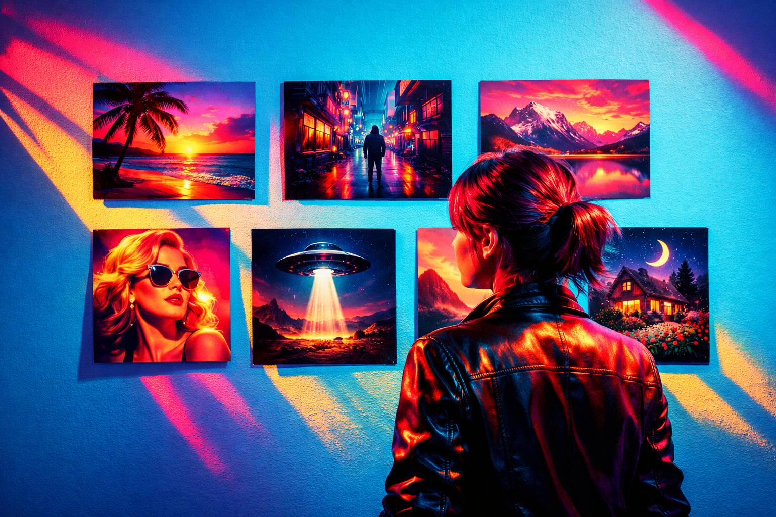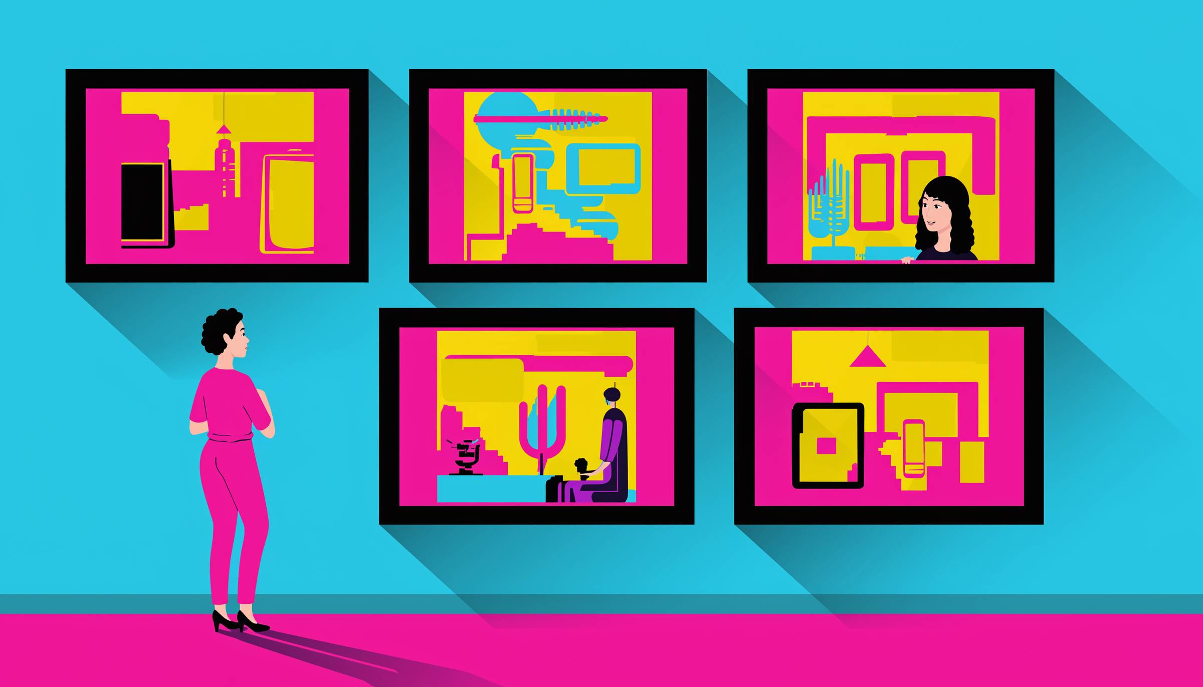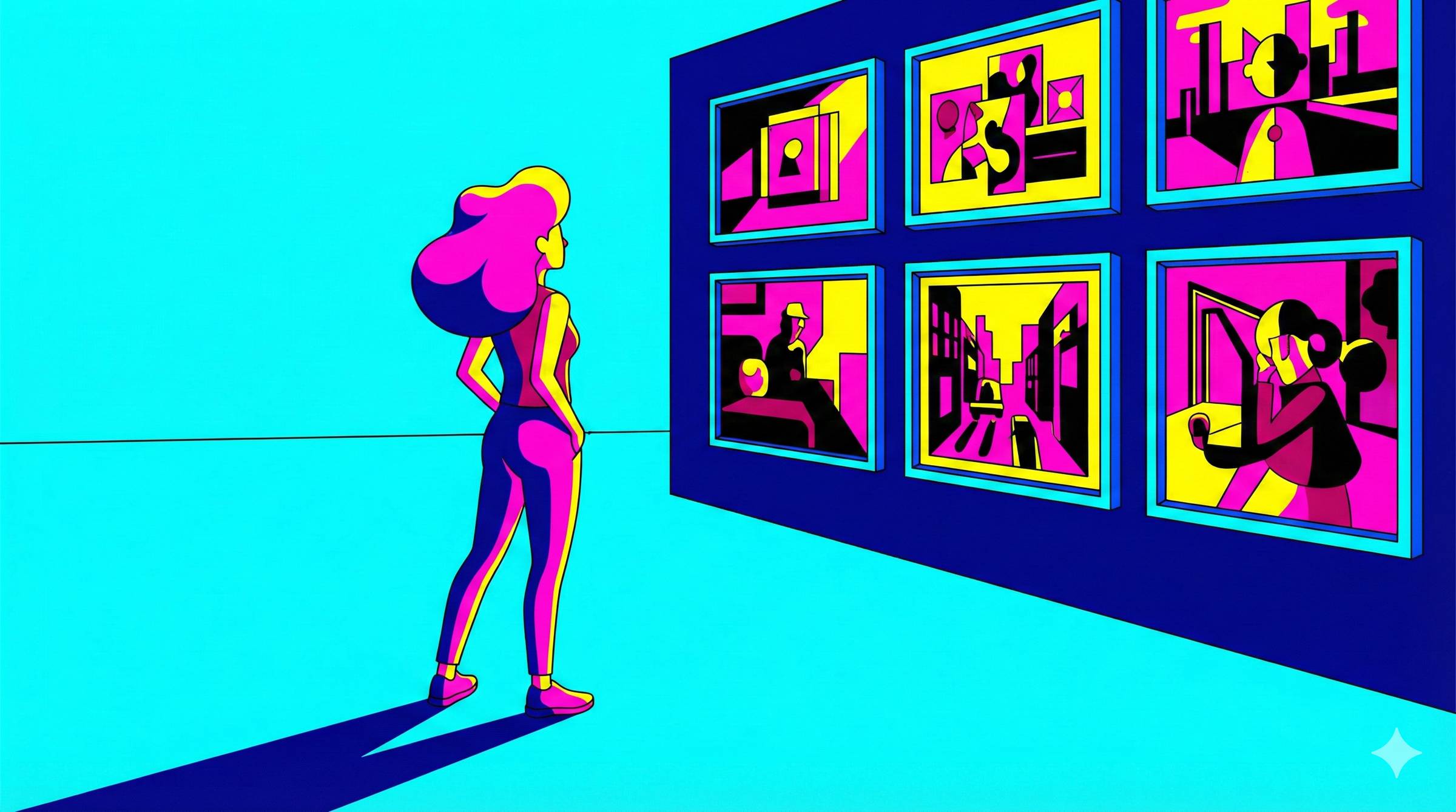 a woman is looking at an array of images on the wall, she's evaluating six different images. A vibrant, high-contrast illustration using flat vector-style shading with neon and duotone color blocking. The characters are stylized with exaggerated lighting in magenta and yellow tones, set against a cyan background. There’s a strong use of shadow and highlight to create depth without using gradients. It uses clean lines and a minimal background to keep focus on the figures and objects. --ar 16:9