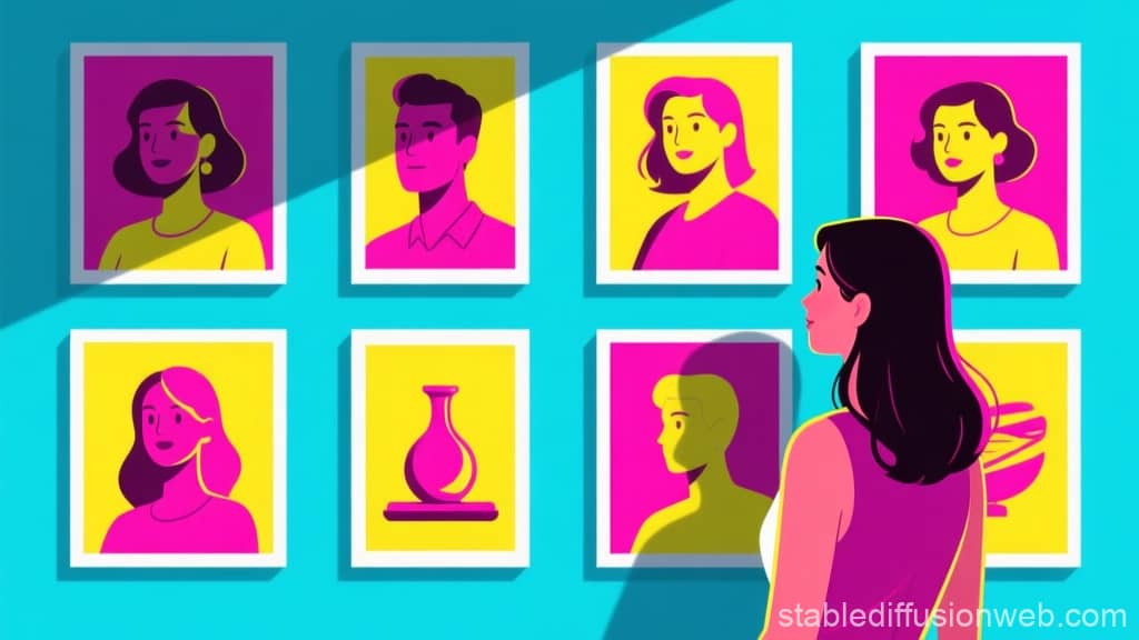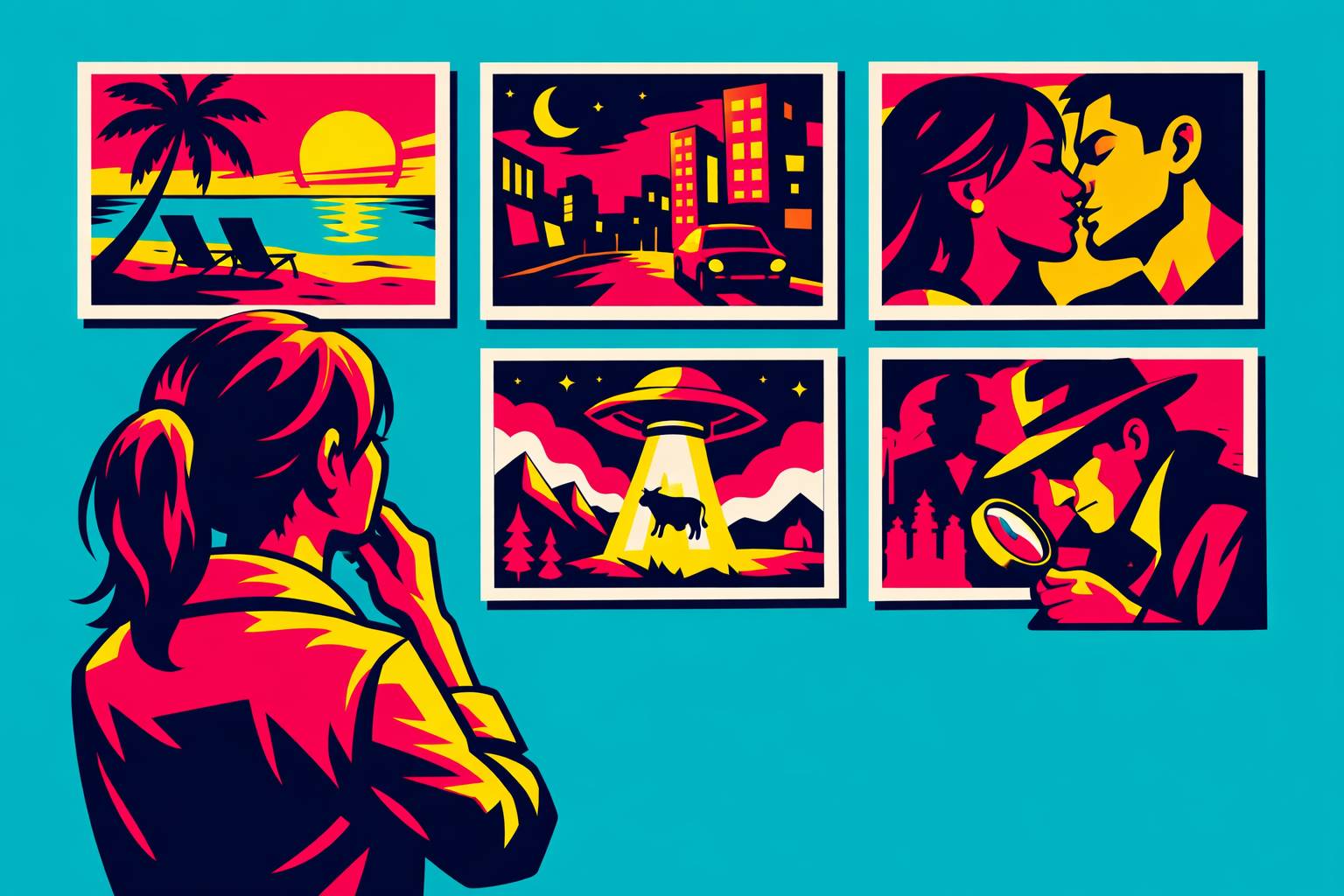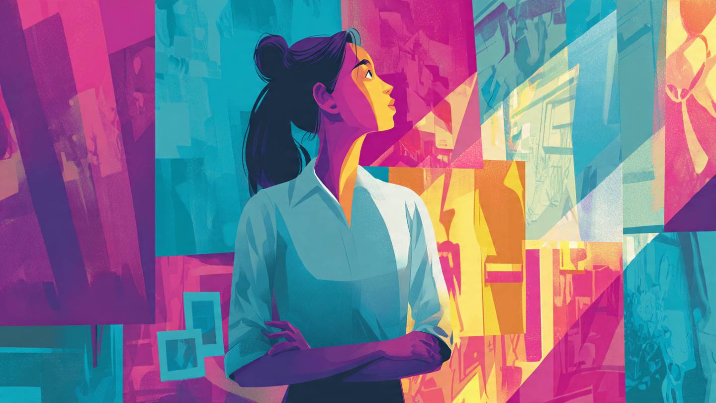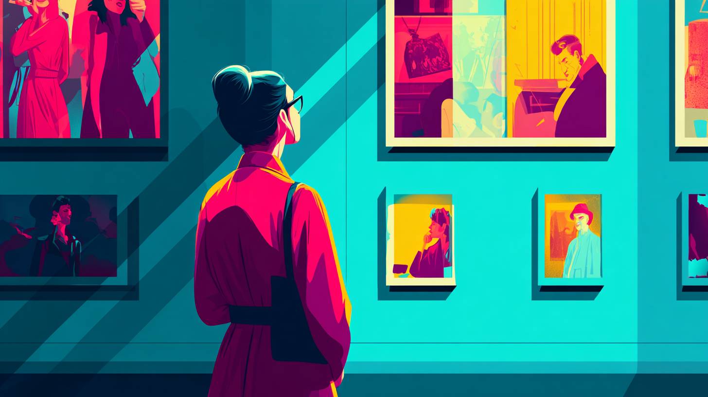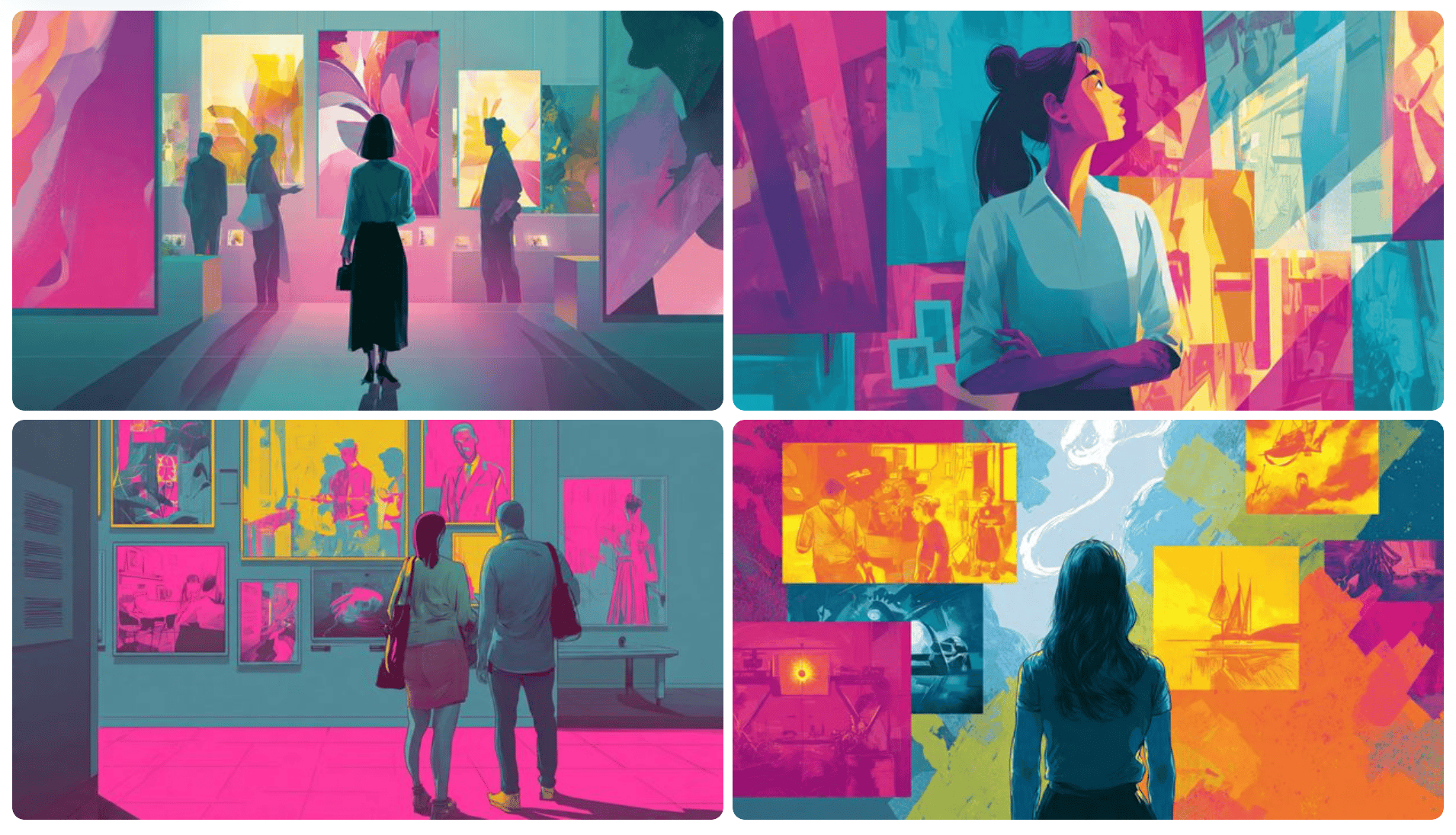 a woman is looking at an array of images on the wall, she's evaluating six different images. A vibrant, high-contrast illustration using flat vector-style shading with neon and duotone color blocking. The characters are stylized with exaggerated lighting in magenta and yellow tones, set against a cyan background. There’s a strong use of shadow and highlight to create depth without using gradients. It uses clean lines and a minimal background to keep focus on the figures and objects. --ar 16:9
