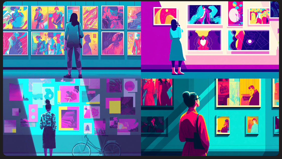 Midjourney does far more than what's expected. The figure is clearly on a different plane than the images on the wall. The lighting adds mood, even though it uses vibrant colors.