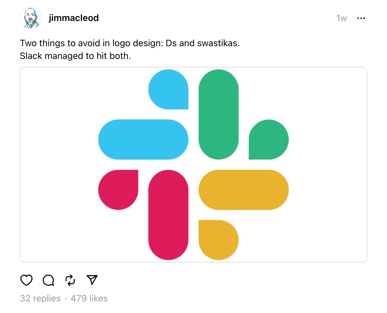 I had my first Thread go viral last week. Tracy Marshall posted about what to look for when designing a logo. I replied with an old joke about the Slack logo looking inappropriate and many designers agreed. What do you think?
