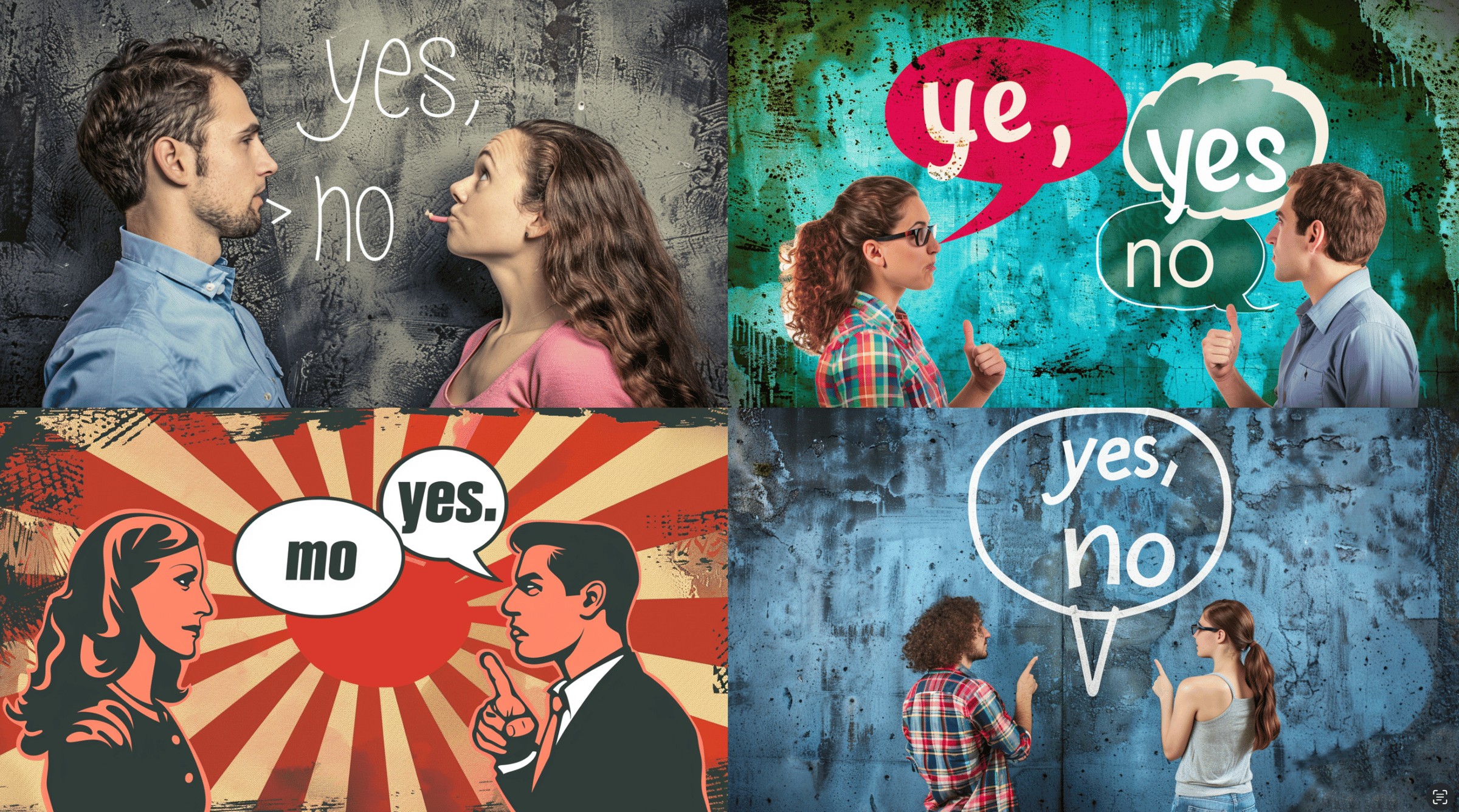 Prompt: two people having a debate. One thinks "yes," the other thinks "no" --ar 16:9