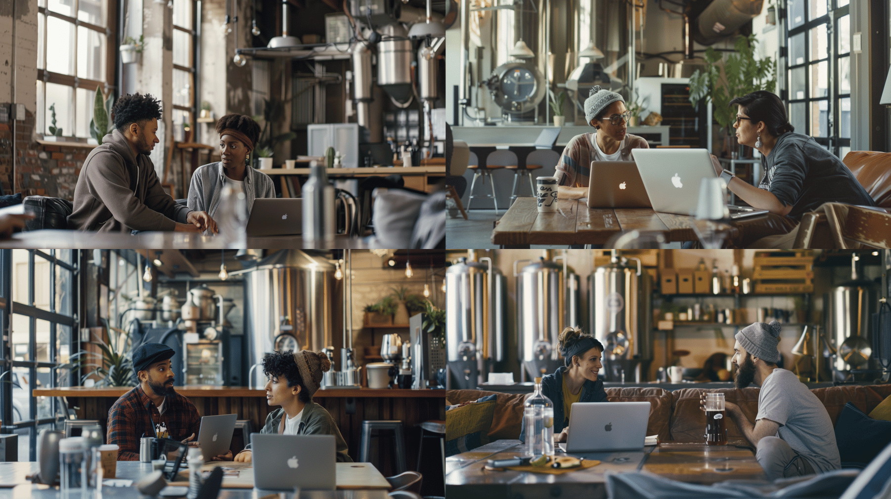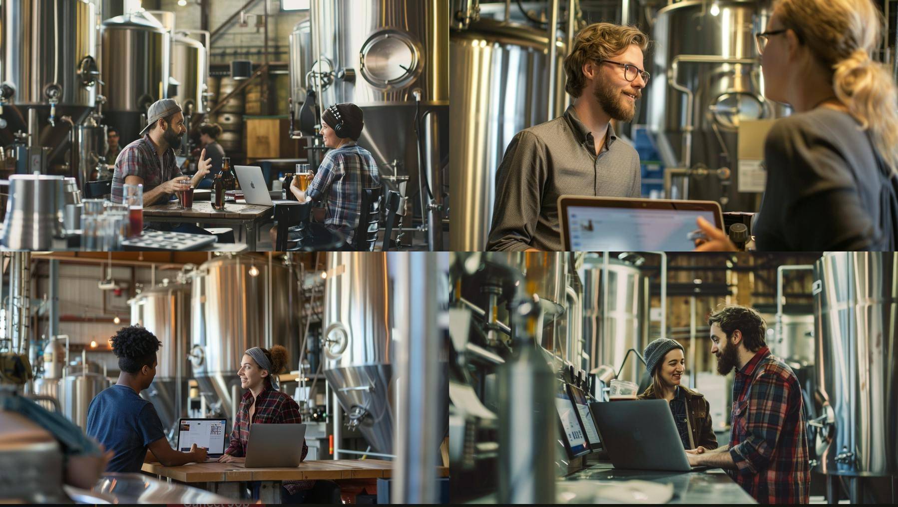 Prompt: two people are having a conversation in a brewery. One of them has a laptop in front of them. --ar 16:9