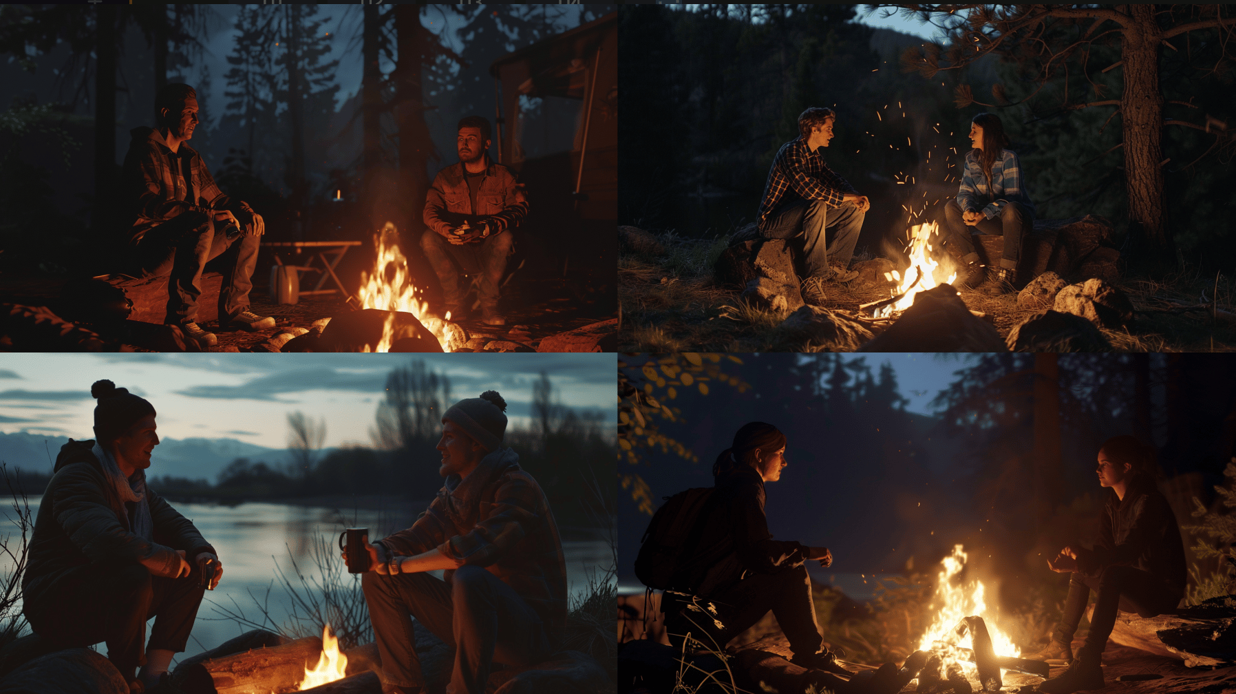 Prompt: two people are having a heated discussion while sitting around a campfire. One looks optimistic. One looks pessimistic. --ar 16:9