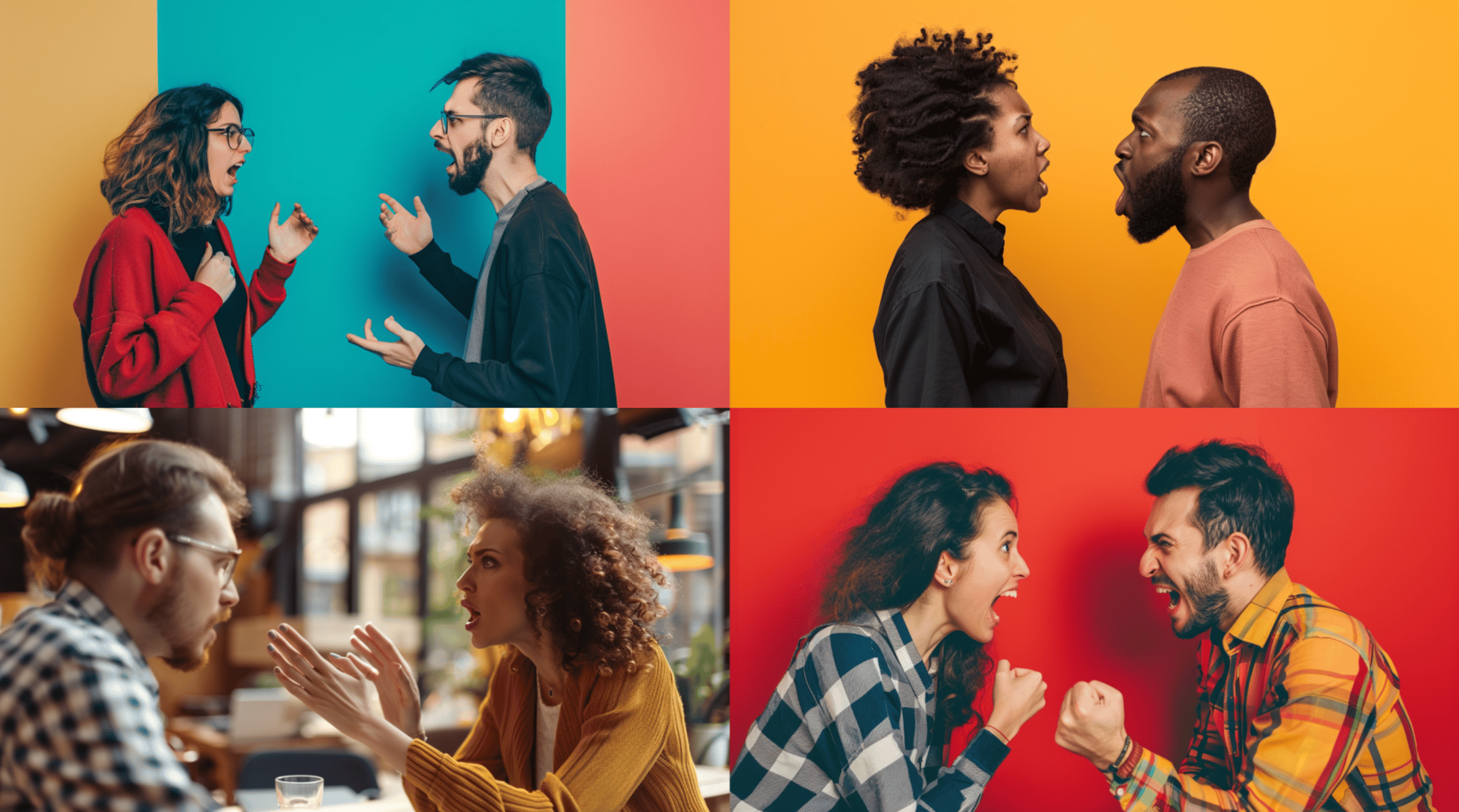 So, let's focus on a different aspect. Let's think about the debate part. My next prompt was "two people having a heated debate --ar 16:9." This was a little better, but still not interesting enough. At least I have a direction I can work with.