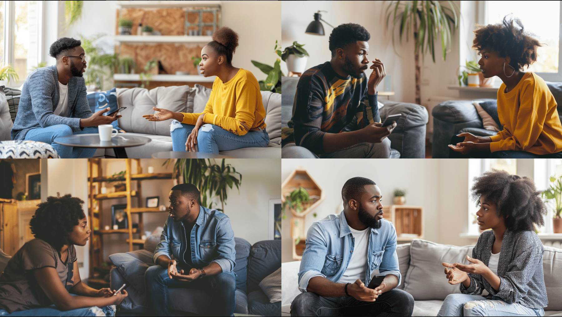 Prompt: two people are having a conversation in a living room. They are having a polite disagreement. One of them has their iPhone in their hand. --ar 16:9