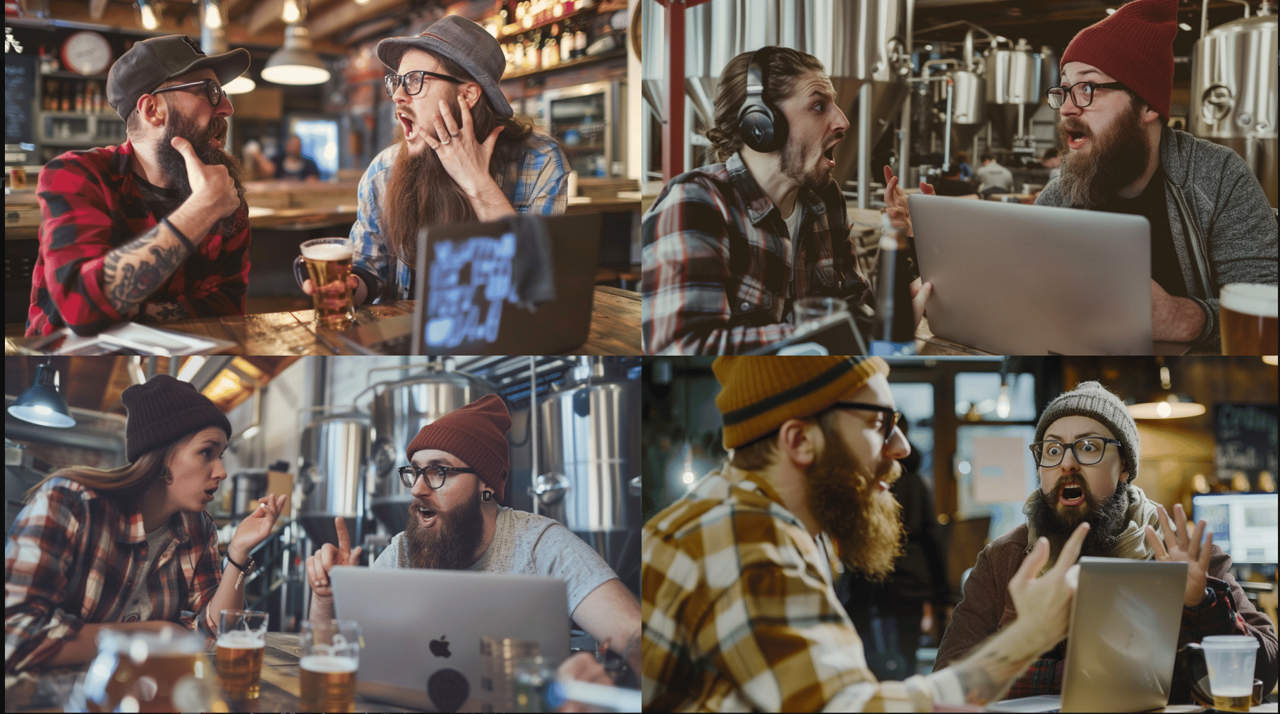 Prompt: Two people are arguing. They both look like hipsters and they're at a brewery. One has a laptop in front of them. --ar 16:9