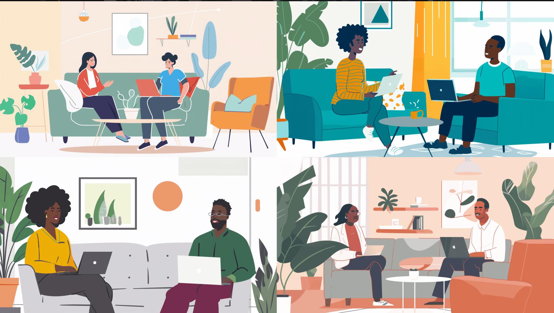 Remix: two people are having a conversation in a living room. One of them has a laptop in front of them. --ar 16:9
